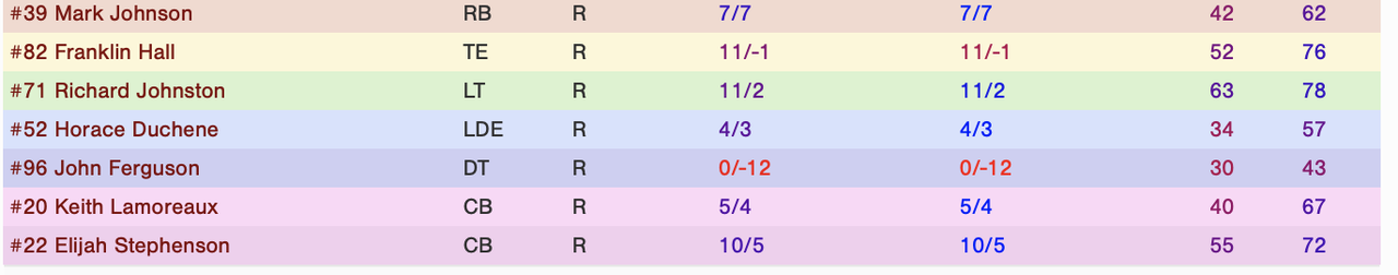 The Gold had an interesting draft. Both LB's that were drafted in the 1st & 2nd did not bust. Which is great because half the LBs on the current roster are getting quite mature. The two rookies boomed up to the upper 70's, but that is pretty good by current standards. Long gone are the days when a team could rock three 90 rated LBs in the starting lineup.