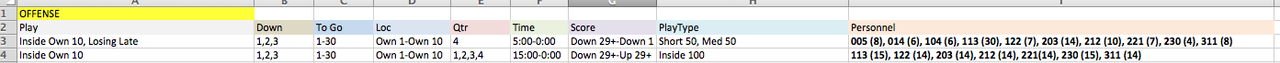 7. I would then set up a rule for each down-and-distance situation. I give them titles by the situation, but I don't use MFN's definition of "long," "medium" and "short." For instance, I might have a first-and-long rule (7-30 yards), first-and-medium rule (4-6 yards), and first-and-short rule (1-3 yards). On defense, I do the same thing, but make one rule vs. run formations and one rule vs. pass formations for each situation.